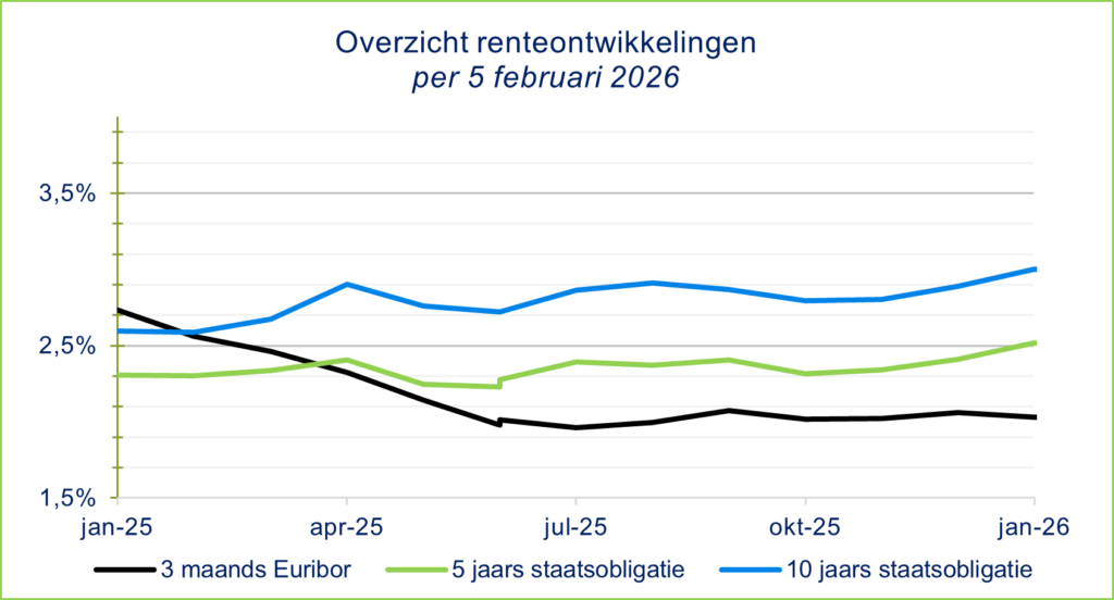 De markt verwacht dat de 3-maands Euribor in het komende jaar rond het huidige niveau blijft, na het besluit van de ECB om de beleidsrente op 2% te handhaven. Kleine schommelingen blijven mogelijk, maar een duidelijke trend wordt niet voorzien. De rentetermijnkoersen voor langere rentes (2-jaars swap en langer) wijzen op overwegend stabiele niveaus, met kans op een lichte stijging ten opzichte van nu.